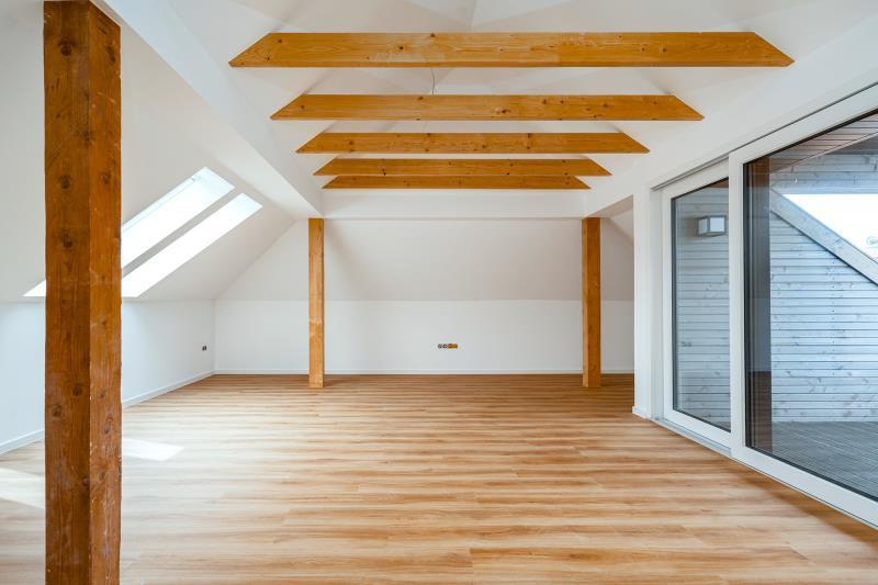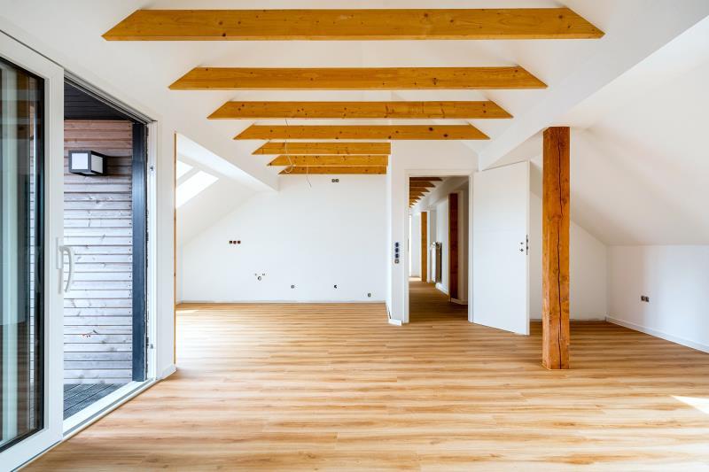 Der große, offene Wohn- und Essbereich mit Zugang zur Loggia ist das Herzstück der Wohnung. Die sichtbaren Holzbalken verleihen den Räumen eine warme, einladende Atmosphäre – ideal für Menschen mit Sinn für Design und das Besondere. Zwei Schlafzimmer, ein modernes Duschbad, ein separates Gäste-WC und ein großzügiger Abstellraum bieten praktischen Komfort für Singles, Paare oder kleine Familien.