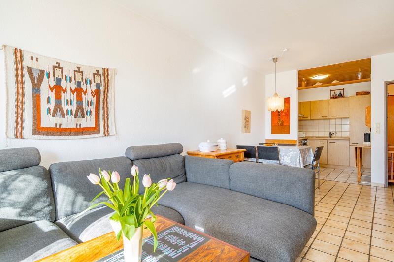 Die Wohnung umfasst eine helle Wohnküche, ein Schlafzimmer, ein Kinderzimmer sowie ein modernes Duschbad. Der offene Wohnbereich führt direkt auf die sonnige Terrasse, die sich ideal zum Entspannen eignet.
