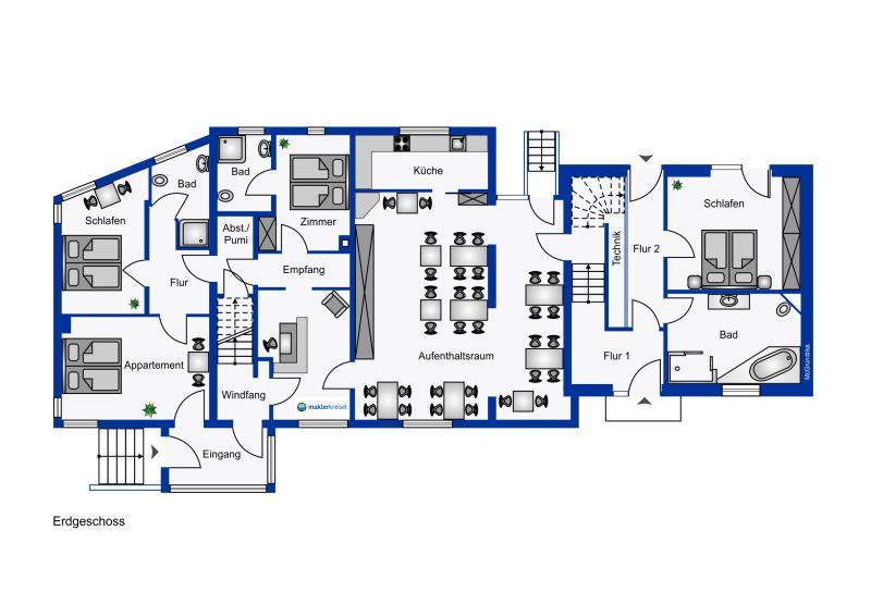 Zur Ausstattung gehört außerdem eine moderne Betreiberwohnung (Baujahr 2017) mit ca. 100 m² Wohnfläche über zwei Etagen, separatem Zugang, Balkon und eigenem Gartenbereich.
