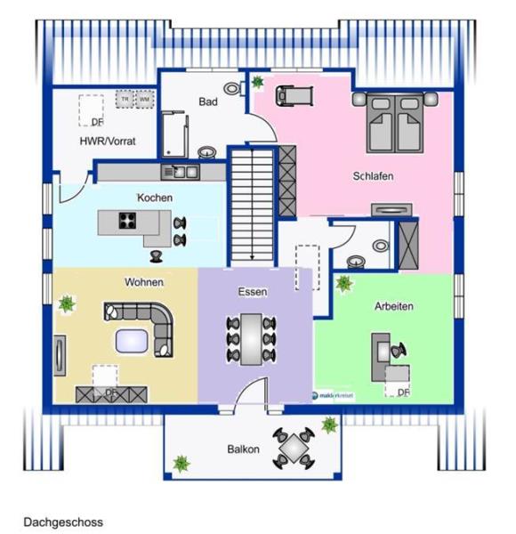 Kochen / Essen / Wohnen, Arbeiten, Schlafen, WC, Bad, Hauswirtschaftsraum / Abstellraum, Balkon