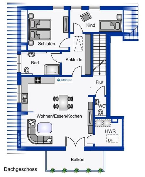 Flur, Wohne / Essen / Kochen, Bad, Schlafen, Ankleide, Kind, Hauswirtschaftsraum, Balkon