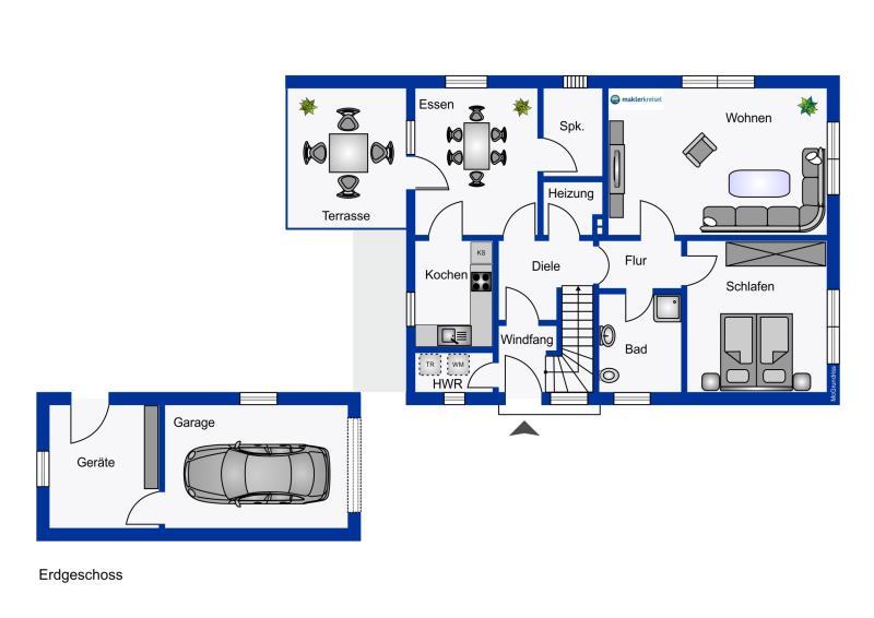 Windfang, Flur, Diele, Wohnen, Essen, Kochen, Schlafen, HWR, Gäste-WC, Heizungsraum, Abstellraum, Badezimmer, Garage mit Abstellraum, Terrasse