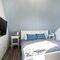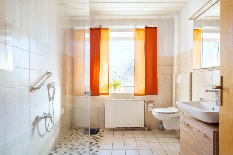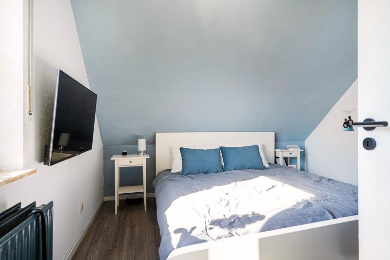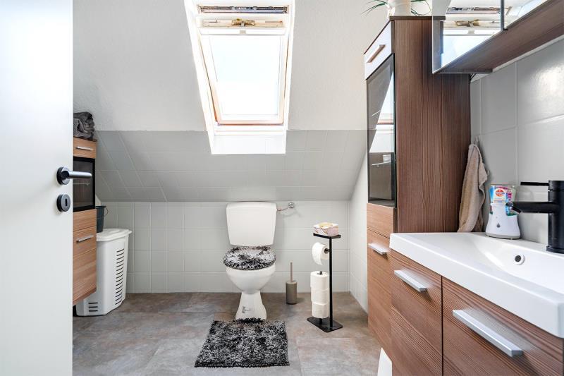 Die obere Wohnung enthält neben der Küche und dem Wohnzimmer zwei Schlafzimmer sowie zwei Duschbäder (teils modernisiert). Der Spitzboden (ca. 19 m² Nutzfläche) bietet zusätzliche Abstellfläche.