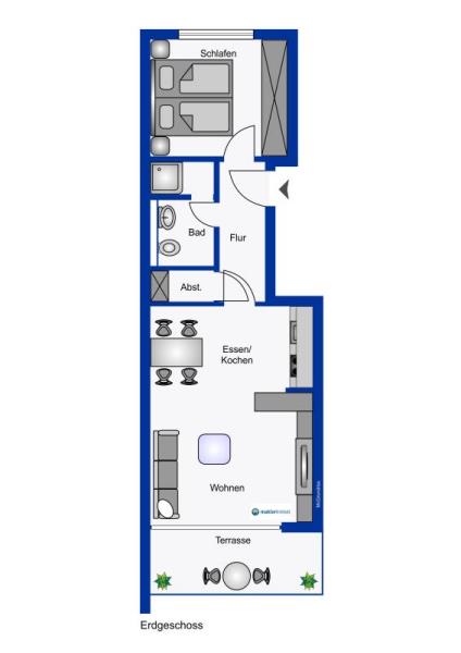Die angebotene Erdgeschosswohnung hat eine Wohnfläche von ca. 47qm und ist wie folgt aufgeteilt: heller Wohn- und Essbereich mit offener Küche inkl. Einbauküche und Zugang auf die Terrasse, Schlafzimmer, Badezimmer mit großer ebenerdiger Dusche, Flur.