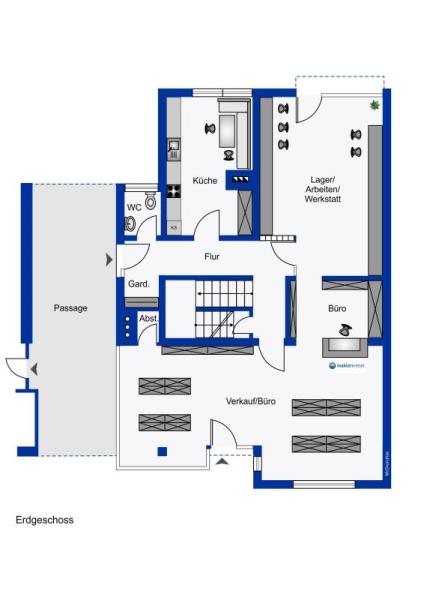 Die Gewerbeeinheit im Erdgeschoss mit ca. 97 qm Nutzfläche wird in Kürze "mieterfrei" und könnte somit Ihrem eigenen Metier dienen. Neben der Lage besticht hier u.a. die große Schaufensterfront und der großzügige Verkaufs- bzw. Büroraum.