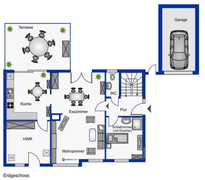 Flur, Wohnen / Essen, Kochen, HWR, Schlafzimmer mit Dusche, Gäste-WC, Terrasse