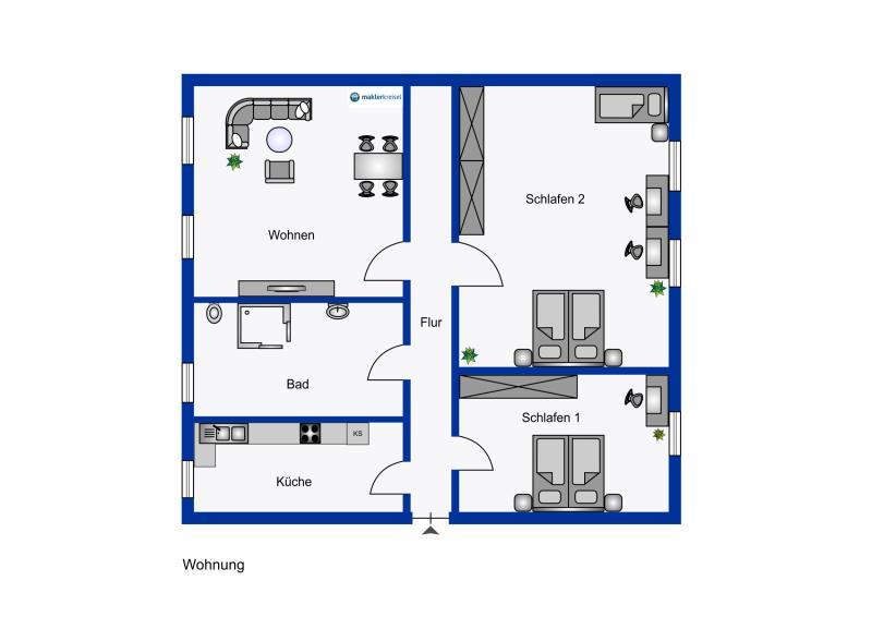 Die Wohnung befindet sich in Obergeschoss eines Wohnhauses mit insgesamt 4 Wohneinheiten und ist wie folgt aufgeteilt: Schlafzimmer, Kinderzimmer, Wohnzimmer, Küche, Badezimmer mit Dusche und Flur.