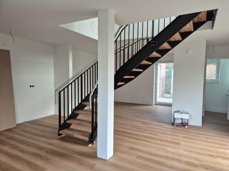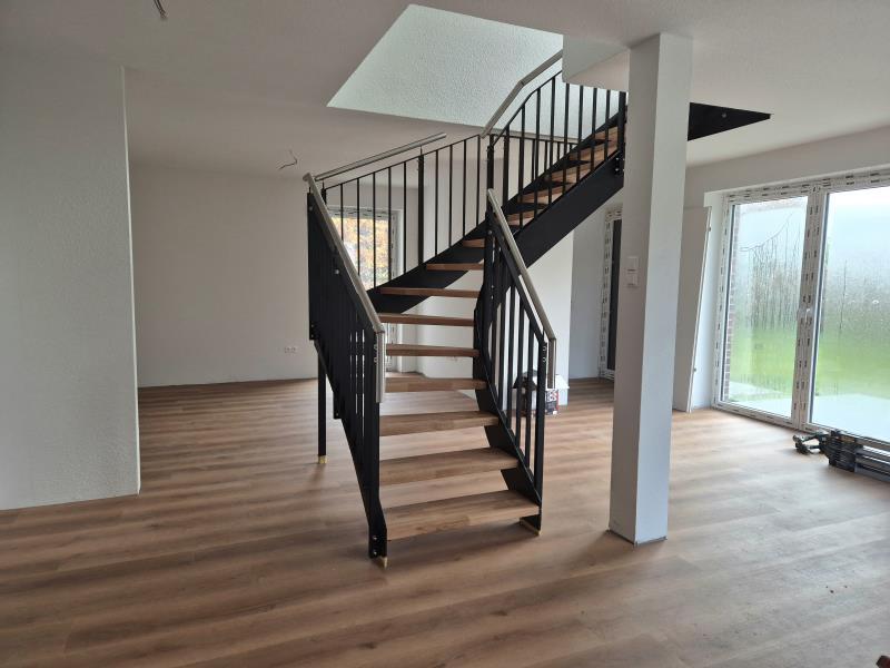 - offene Stahltreppe mit Holzstufen in der Wohnungsmitte