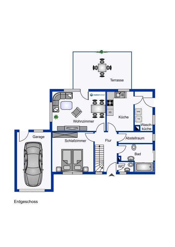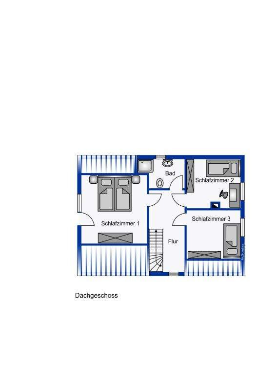 Im Erdgeschoss befindet sich neben dem hellen Eingangsbereich ein Wohnzimmer mit Ausgang auf die Terrasse, ein Schlafzimmer (ebenerdiges Wohnen möglich), ein großzügiges Badezimmer mit Badewanne, eine Küche mit separatem Abstellraum und Ausgang nach draußen, ein kleiner Abstellraum im Flur sowie ein Gäste-WC. Über die Treppe im Flur gelangen Sie in das Dachgeschoss des Hauses. Hier befinden sich drei Schlafräume, einer davon mit Ausgang auf eine Dachterrasse über der Garage, sowie ein kleines Badezimmer mit Dusche. Der Spitzboden bietet Ihnen reichlich Abstellfläche.
