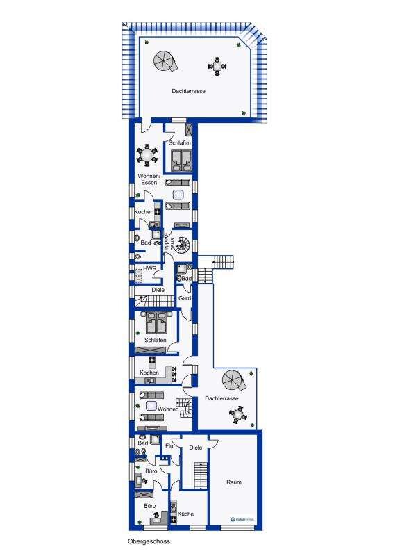 Beide Einheiten haben jeweils eine eigene großzügige Dachterrasse, eine Wohnung ist, wie bereits erwähnt, aktuell nur über die Arztpraxis erschlossen..