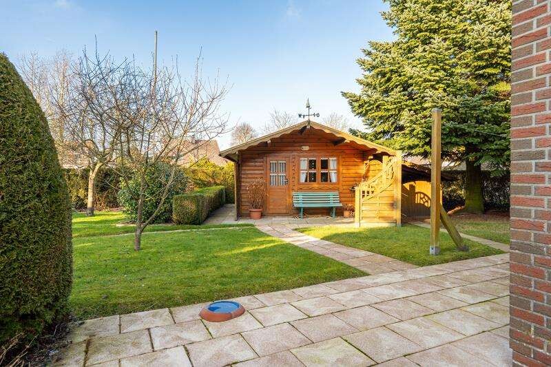 Der Garten ist eingefriedet und liebevoll, dennoch pflegeleicht angelegt. Zwei große Gartenhäuser laden zum Verweilen ein.