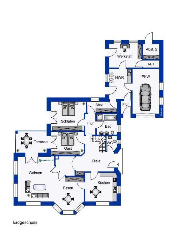 Diele, Kochen, Essen / Wohnen, Schlafen, Gast, Gäste-WC, Duschbad, Garage mit Werkstatt, Hauswirtschaftsaum, Abstellraum, Terrasse