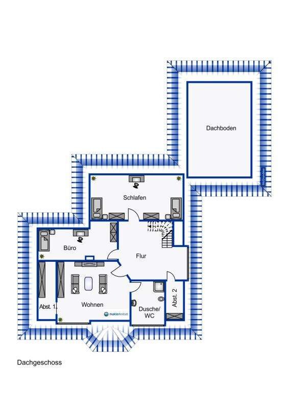 Flur, Wohnen, Büro, Schlafen, Duschbad, Abstellfläche, Dachboden