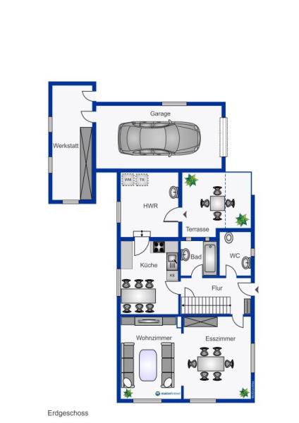 Erdgeschoss: Wohn-/Esszimmer, Küche, Badezimmer, WC, Hauswirtschaftsraum, Flur,