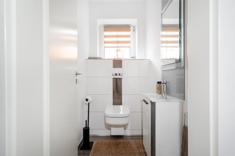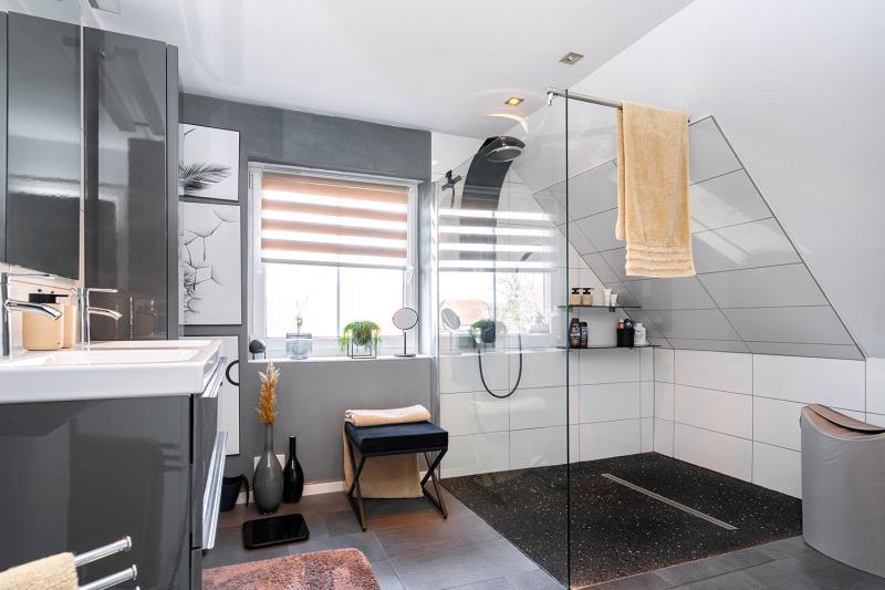 Ein weiteres Highlight ist neben dem großzügigen Schlafzimmer im Dachgeschoss (kann mit wenig Aufwand wieder zu zwei Zimmern umgebaut werden) das geräumige Duschbad mit großer Walk-In-Dusche.